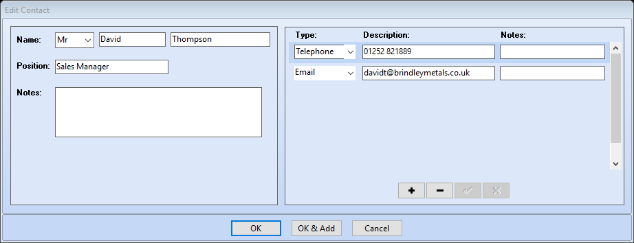 To create further whilst in this same window, select the OK & Add button, a blank Edit Contact window will appear, insert all relevant contact detail as before.