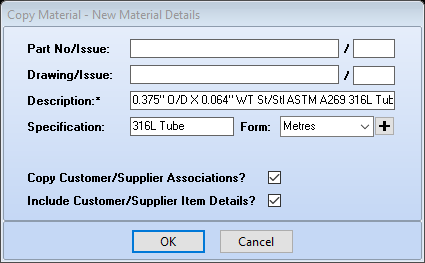 Please Note: when using this option all detail from the material being copied will be retained for the new material, therefore it is important to check all information prior to using this material i.e. cost, measurement, supplier, form and unit of measure.
