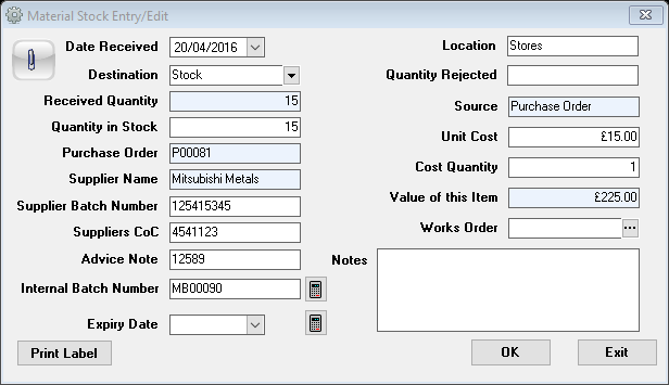 Works Order – Use the search button to open the Works Order Search Screen, to assign a works order to the stock batch