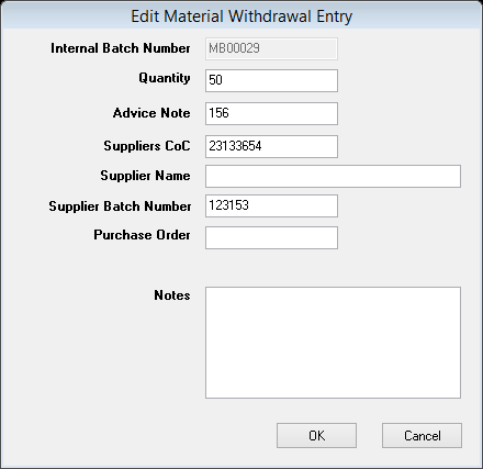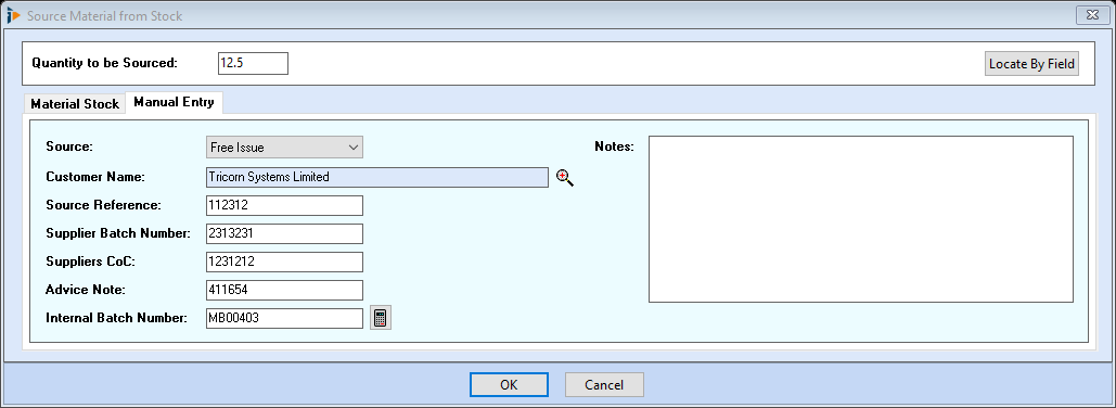 Select the Manual Entry tab, in the drop down select Free Issue, enter all relevant information in the fields below. Using the looking glass button select the customer name supplying the goods and the calculate button to insert an Internal Batch Number. Notes relating to this entry can be inserted in the free type field. All information will appear on a Certificate of Conformity as required.