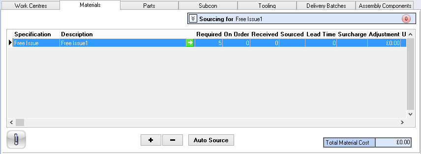 Add a material line, in the above illustration Free Issue1 has been used. Select the sourcing button, then Stock to open the Source Material from Stock window.