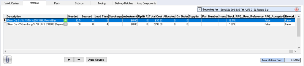 To source material against the works order select the Sourcing for drop down box; the relevant content of the drop down is dependent on the highlighted material within the table