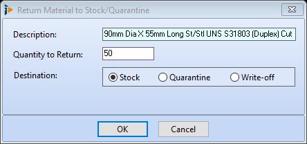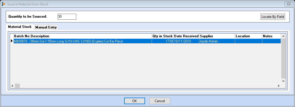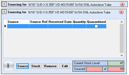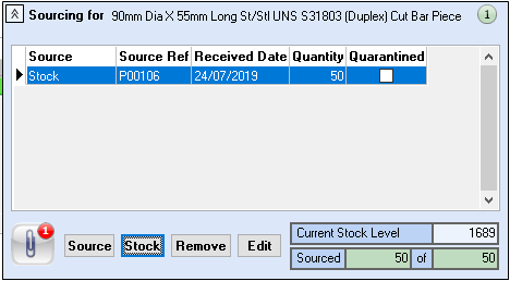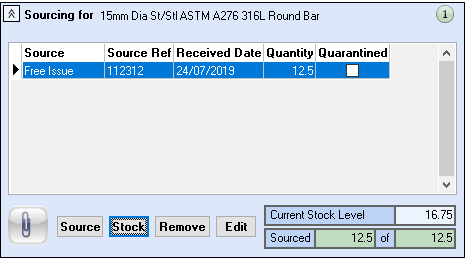 Stock – selecting the stock button will open the Source Materials from Stock window where all available levels of stock will be displayed. Select the required batch.