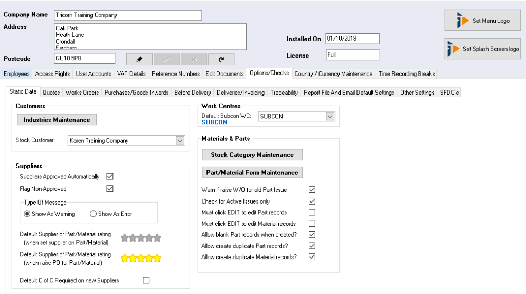 Options and checks apply individual changes to each module within Tricorn. It is important to consult Tricorn Systems before attempting to change any settings as the description may not always be as clear as expected.