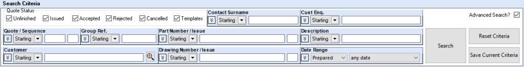 A wildcard of * can be used to limit the search criteria within each field e.g. *35* will retrieve all quotations containing 35.