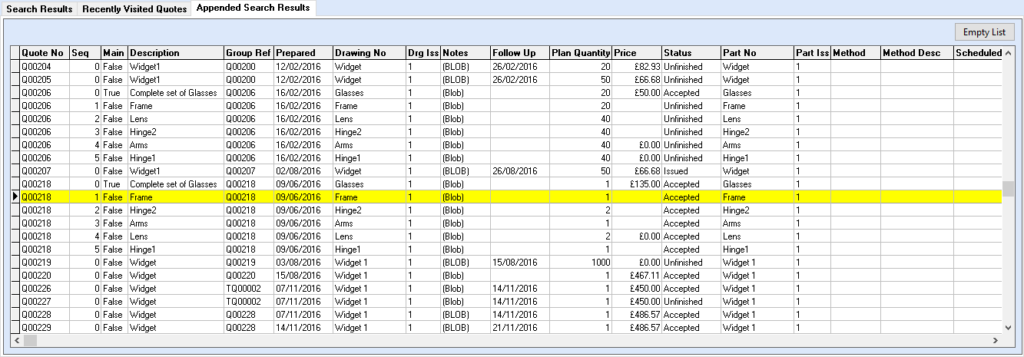 Having selected the Append Results button within the Search screen all records will appear in the Append Search Results table. To remove records, use the Empty List button.