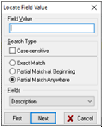 The Find Dialogue button opens the Locate Field Value window where searches can be made using the selected criteria. Once a search has been made using this feature will enable users to search further within the window.