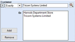 Within each criteria field there is a double chevron that enables more in depth filtering of data. Use the Add button and enter the detail of filter required, in the illustration the search will be for two companies Tricorn and Harrods.