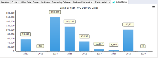 A bar chart displaying the value of sales by year – options include Batch Delivery Date, Delivery Date and Invoices.