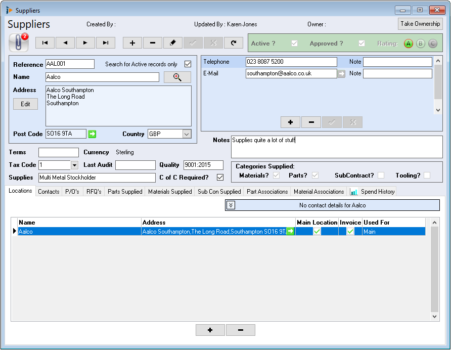 The suppliers screen records data relating to: