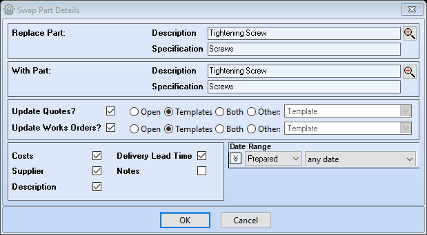 Update Quotes? – tick options to be taken into consideration when updating quotes using this part