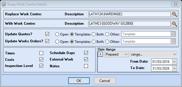 Update Quotes? – tick options to be taken into consideration when updating quotes using this new work centre