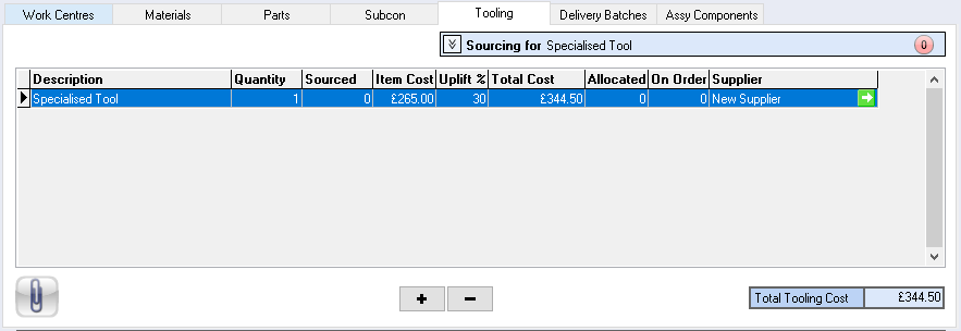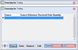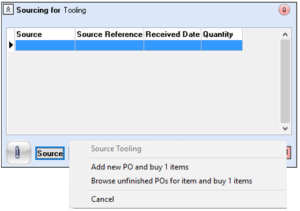 Source – selecting the source button will open a mini menu where further options are displayed relating to how this tooling is to be sourced, i.e. through a purchase order