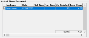 Times will be recorded in the Actual Times Recorded table, multiple entries against the same operation will be listed with accumulative time and quantity