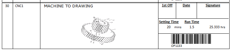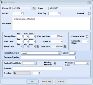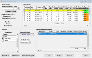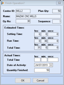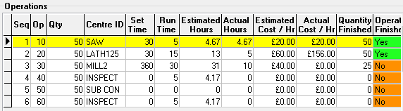 Finished – indicates the status of operation Yes/No/WIP, colour will change accordingly, Red for not started, Yellow work in progress and green for finished. Use the CTRL key and click on this field to open a mini time recording window, enter the actual time, date and quantity finished for this operation