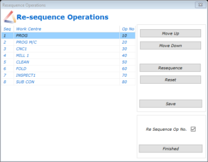 Re-sequence button will re-sequence the operations as required. Select the operation to be moved, use the Move Up/Move Down buttons to reposition. Select Resequence to reset the sequence numbers, Save to save all changes, Finished to close window