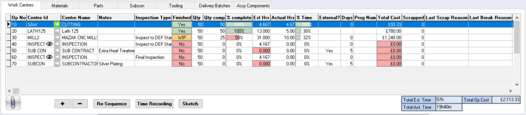 Work Centre subtab collates all operations required for this works order.